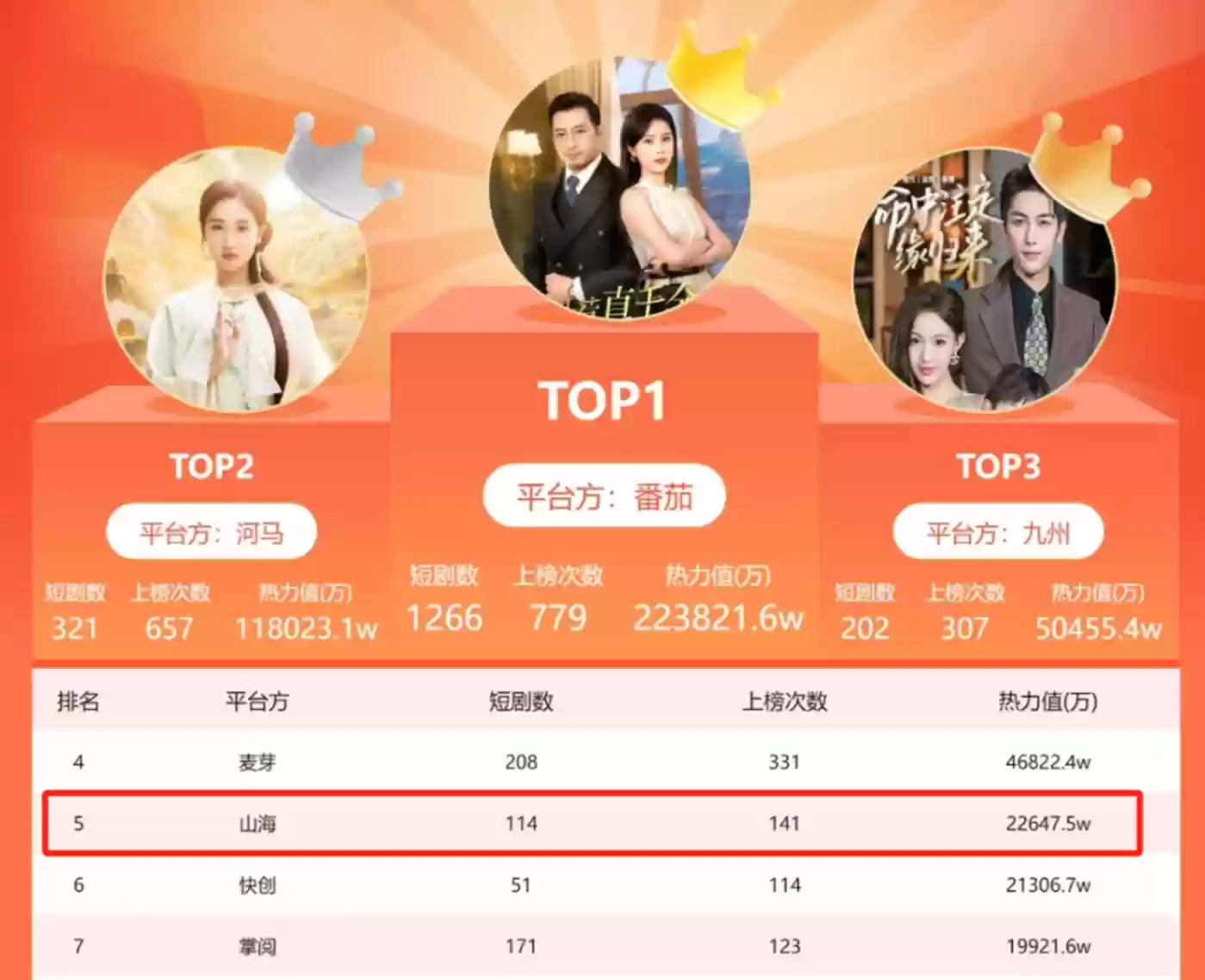 在短剧领域,山海星辰实力强劲。据2025年Q3DataEye百强平台榜,山海星辰位列行业第五,累计热力值超2.26亿,稳居第一梯队,而男频题材在其中功不可没。