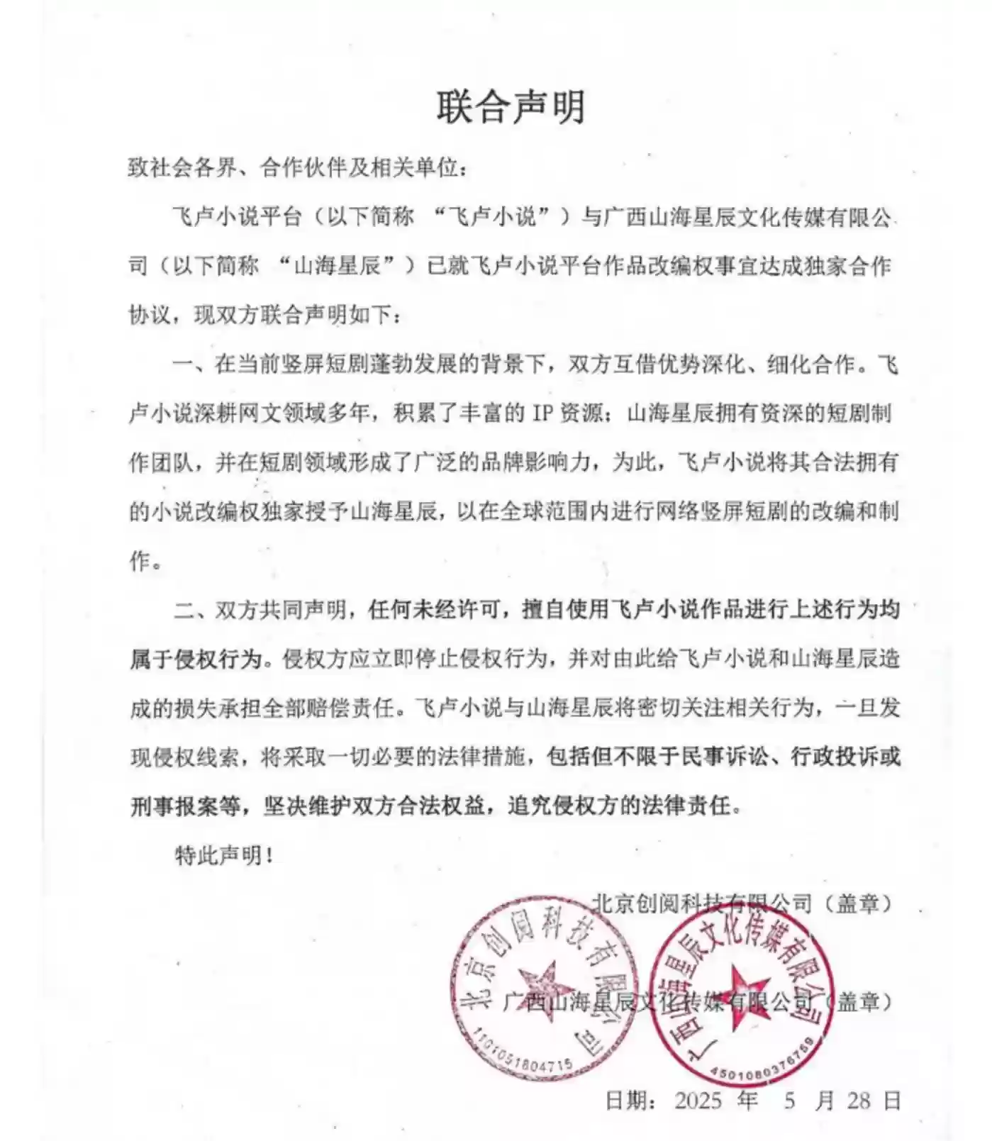 2025年5月,短剧头部平台山海星辰与网文平台飞卢小说达成独家合作,前者成功获取飞卢全量作品的改编权。