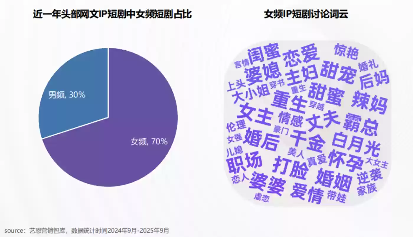 艺恩报告指出,近一年头部网文IP短剧中,女频短剧占比高达70%,男频仅占30%。女频IP短剧已步入红海竞争阶段,成为行业必争领域。