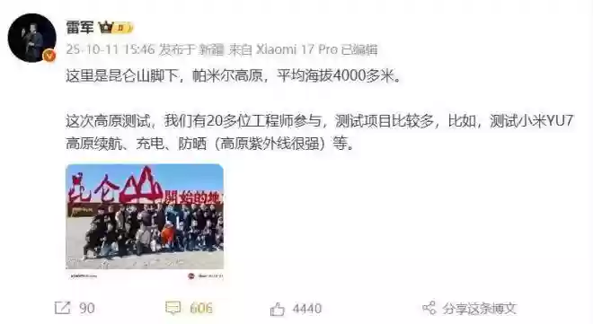 截至目前,小米公司创始人雷军未对此事故作出公开回应。有网友称10月10日在喀什古城偶遇雷军,而其社交媒体账号动态显示,在10月11日至12日期间,雷军多次发布小米工程师在帕米尔高原测试新款车型YU7的内容,涉及高原续航、充电性能等项目。