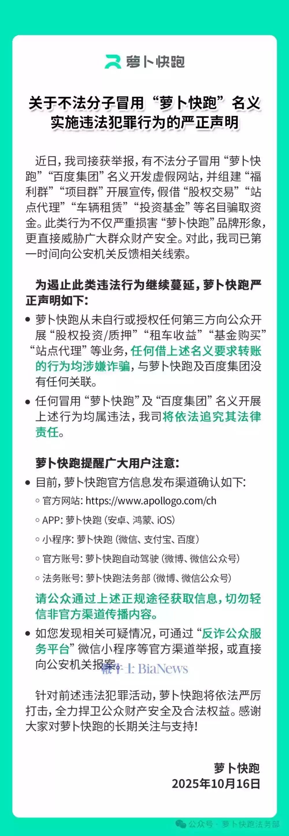 萝卜快跑严正声明:警惕虚假投资网站诈骗