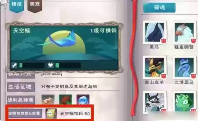 根据游戏图鉴显示,驯服一只天空鳐理论上需要准备50包饲料。