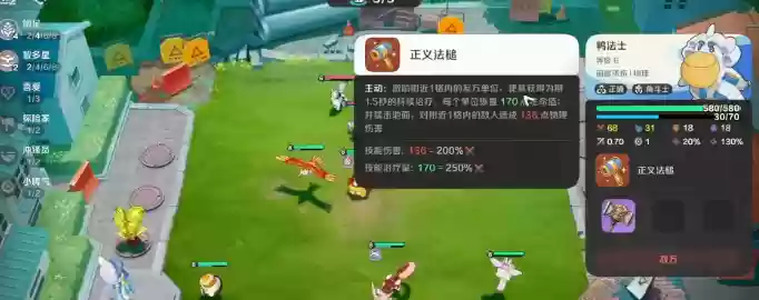 鸭法师的原理机制颇为独特,属于正确元理类角斗士特性。其技能“正义法锤”可对周围一格范围内的友方单位产生激励效果,使其获得持续1.5秒的治疗回复。与此同时,通过锤击地面,还能对附近敌人造成物理伤害。无论是技能伤害还是治疗效果,都与鸭法师自身的物攻属性密切相关。正确元理这一特性,还能为队伍带来30%的攻击力提升增益。