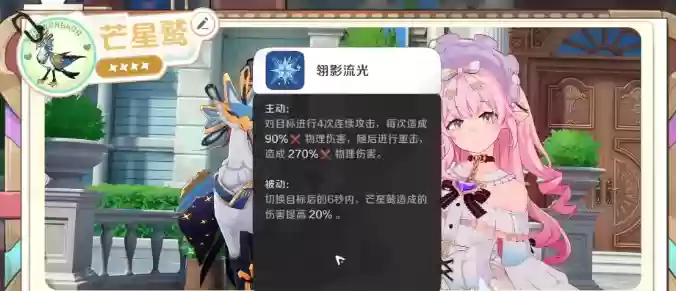 在技能机制方面,芒星鹉扮演着前线物理输出核心的角色。它的主动技能能够对同一目标连续发起四次追击,每次均造成90%物攻属性的物理伤害,最后再补上一次强力重击,爆发出270%物攻属性的物理伤害。