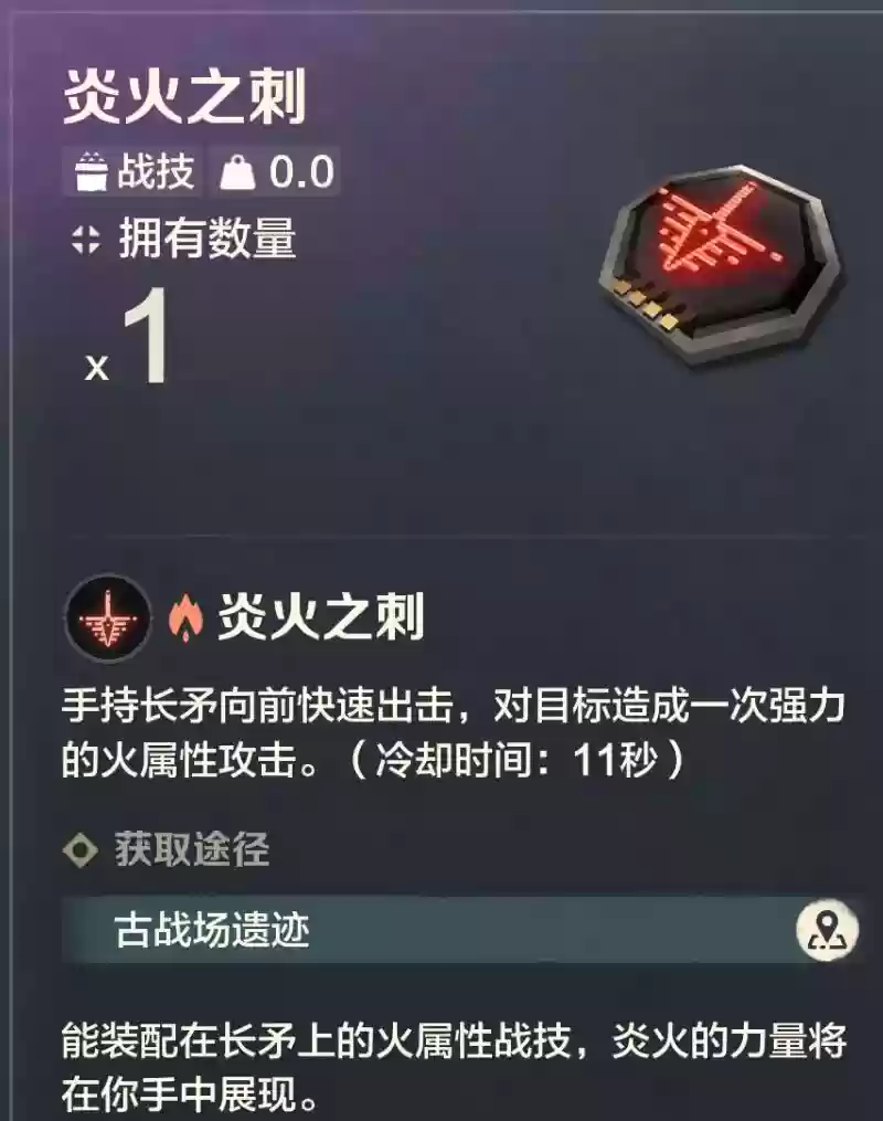 荒野起源中的火焰之刺究竟有何妙用?对于刚接触这款游戏的玩家而言,长矛可以说是最易上手的武器之一。相比其他兵器,长矛的攻击距离明显更远,能够让新手玩家在安全距离内有效应对敌人。今天我们就来详细解析火焰之刺这个技能,作为长矛武器的专属战技,它能在短时间内爆发出惊人伤害,感兴趣的玩家不妨一起来了解下。