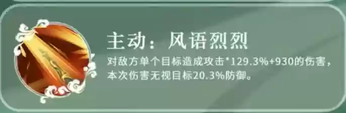 徐庶的另一个主动技能"风雨烈烈"需要手动操作,目标是敌方的单个单位。这一技能造成的攻击数值达到129%,固定伤害值为930点,而且能够无视敌人20%的防御。在他的另一个被动技能"春雷震"上,可以获得忽视反震的效果,此时自身忽视反震数据达到21%,并在攻击敌人时附带无视11%防御的效果。如果使用"星列满目"时触发这个被动,还能对被驱散增益的敌人造成额外伤害,提升幅度达到42%。若该技能作用于被驱散增益的敌人,此时还会触发集思广益的被动效果。因此徐庶各个技能之间的联动效果,在一个回合内可以实现多次触发。
