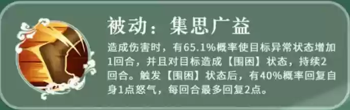 在被动效果方面,徐庶的"集思广益"技能在造成伤害时有65%概率触发,能够延长敌人身上的异常状态一个回合。此时对敌人造成的困惑状态持续时间会更长,可持续两个回合。这个被动效果触发后,还有40%概率为自己回复两点怒气。值得注意的是,这个被动在一个回合内可以多次触发。