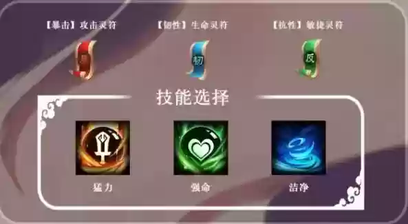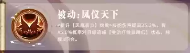 而她的最后一个被动叫做“凤仪天下”,这个技能是跟她的凤凰泣血效果有关的,这个被动触发的时候,就可以给她自身凤凰爱心的状态带来技能伤害提高的效果,提升的数值达到了25%,而且还有45%的概率可以给敌人带来一个受治疗降低的影响状态,这个负面状态在持续3个回合里面,大家就可以根据己方队伍的输出进行激活。如果大家想要张春华更好用的话,这里可以给她考虑到的灵符有暴击攻击类的灵符,然后还有韧性生命灵符也是比较适合张春华的,最后就是抗性类的灵符也很适合她,因为她毕竟是一个控制类的武将嘛。那么,这里给他搭配额外的技能选择,可以推荐的是猛力加上强力以及洁净,这样的话,让她的净化能力可以更好用一些。