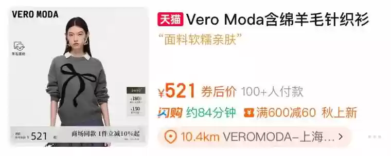 阿里电商全域超10亿的流量池也在持续滋养淘宝闪购生态。继天猫品牌店铺私域展示闪购商品与服务后,在双11前几天,淘宝搜索和信息流里都出现了闪购相关产品,Veromoda、Only等品牌的多个商品均显示可提供即时配送服务。这不仅为用户提供更便捷的服务和更优价格的商品,也为品牌带来更大的增长空间。