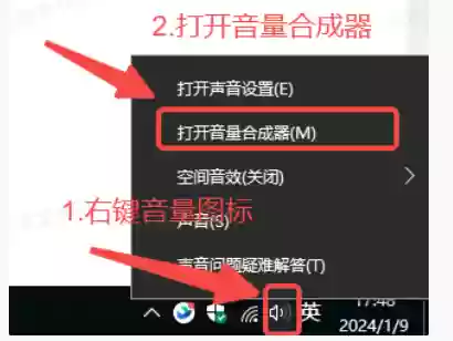 音量合成器打开方式:桌面右下角操作如图所示,也可以直接在开始菜单搜索“音量合成器”。