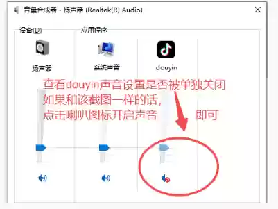 打开音量合成器,查看是否抖音(客户端)或浏览器(网页版抖音)的系统声音被关闭。