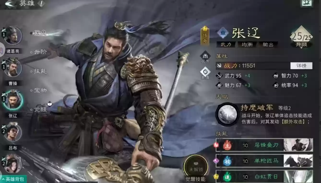 第二个为大家推荐的武将叫做张辽,张辽的特点就是可以让追击技能触发完以后,再追加一次输出,所以算作是在自己的技能使用完之后,还可以额外带来两次行动,虽然这个行动是被动的追击效果,但是一次连招他就可以连打两次,所以这里的机制让张辽短时间之内打出来的伤害可以跟很多的输出武将对比,特别是大家如果需要打一些后排脆皮的时候,那么张辽是绝对可以用上的一个武将,而且他这一击的输出量也不小,建议大家在推图的时候可以上一个张辽。