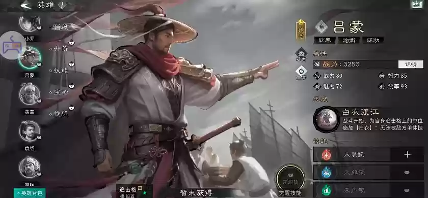 首先要给大家介绍的就是吴国里面的吕蒙,吕蒙这个角色他的天赋就是非常有特点的,他的天赋叫做白衣渡江,这个天赋是一个类似被动的效果,可以在战斗一开局的时候就使用起来,而且在一开局触发的话,后面的几个混合当中都是可以持续生效的,带来的主要效果就是给队友带来一定的隐形护盾效果,所以是属于一个保护类型的技能在追击格上的武将,有他这个天赋保护的话,就不会被敌人的单体技能给击中,那么在前几个回合,大家可能在防护能力上面不那么强的时候用到吕蒙,至少在自身队伍的生存上面,大家不用担心中前期就被对方给压制,后期的话用他这个技能也可以放心地进攻起来,这样在开局里面大家就可以利用吕蒙的效果得到足够的优势。