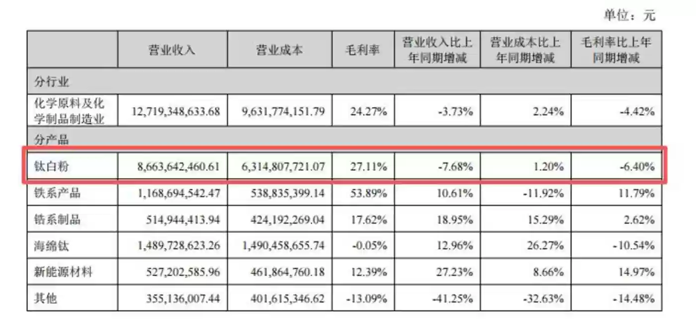 财报显示,2025年上半年,龙佰集团钛白粉业务营业收入为86.64亿元,同比下降7.68%。