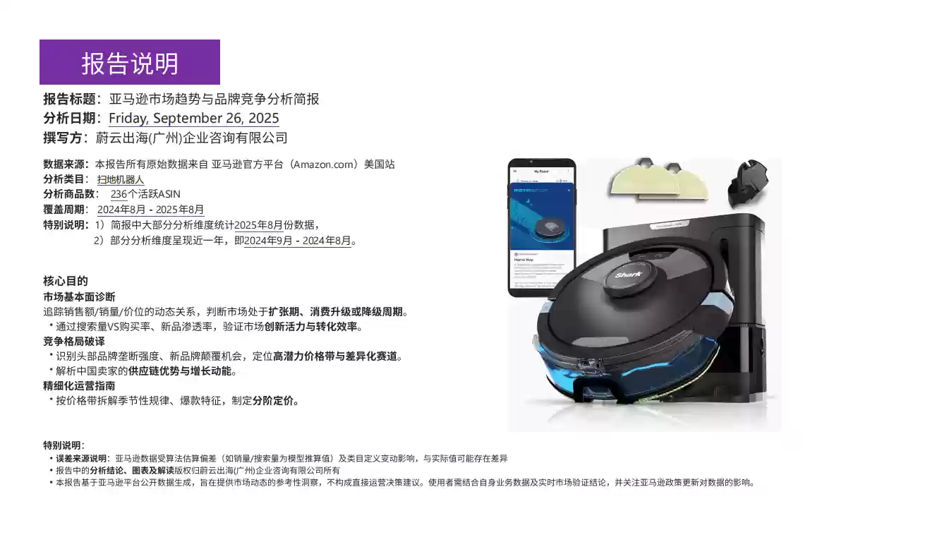 当智能家居浪潮席卷北美市场,"懒人经济"正成为扫地机器人品类增长的重要驱动力。蔚云出海最新发布的行业报告显示,2025年8月该平台扫地机器人销售额达1.31亿美元,同比激增92.3%,销量突破40万台大关。在这场消费升级浪潮中,中国品牌凭借技术创新与精准需求洞察,正在重塑市场格局。