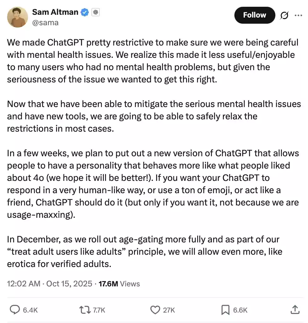 他表示,为了维护用户心理健康,过去对ChatGPT设限过严,未来将逐步放宽这些限制,让人工智能的对话风格更具人情味和个性。