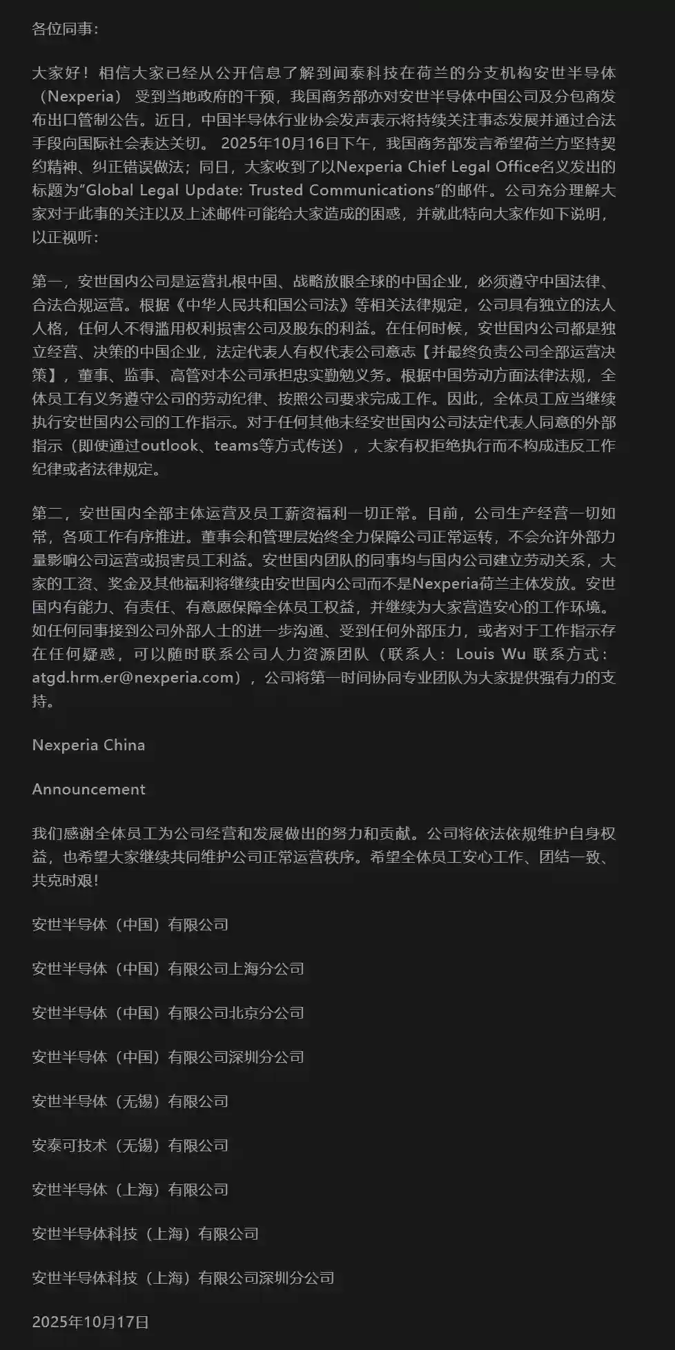 10月19日消息,安世半导体中国有限公司最新微信公众号于10月18日下午发布《安世中国致全体员工》公开信,信中明确要求全体员工继续遵循安世国内公司的统一工作指导。同时,安世国内公司的整体业务运营以及员工的薪资福利待遇等均保持正常。