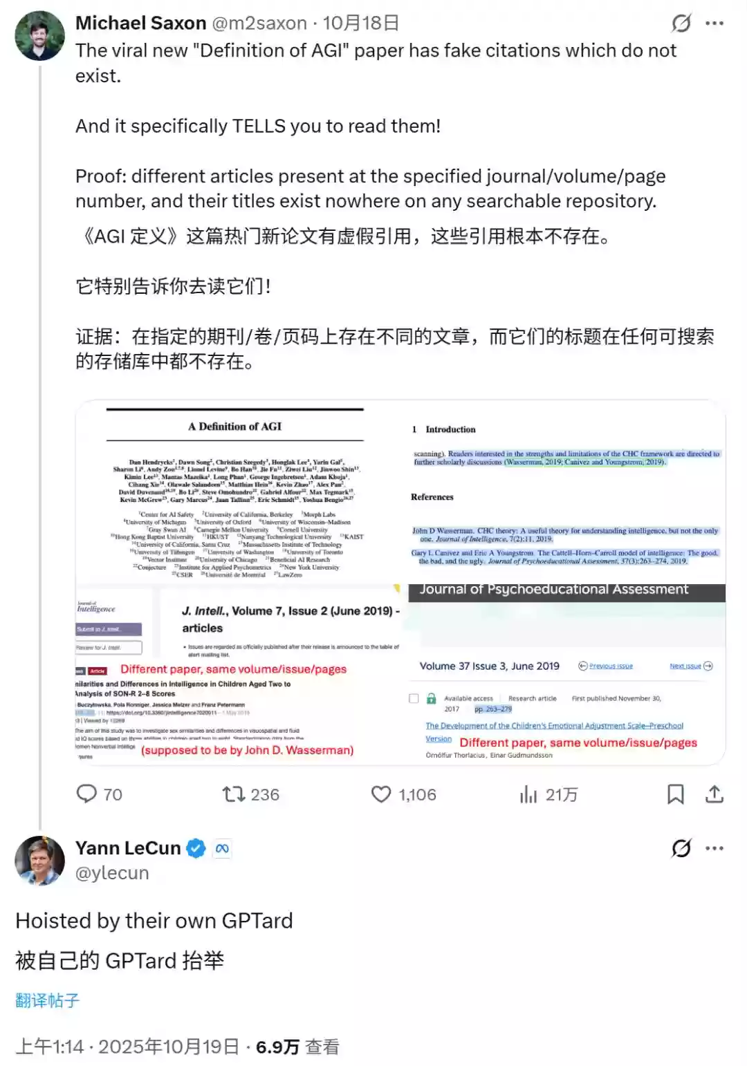 搞笑的是,就在同一天,Lecun在一篇指出最近的热门论文《Definition of AGI》中存在虚假引用的帖子下回复了同一句话。