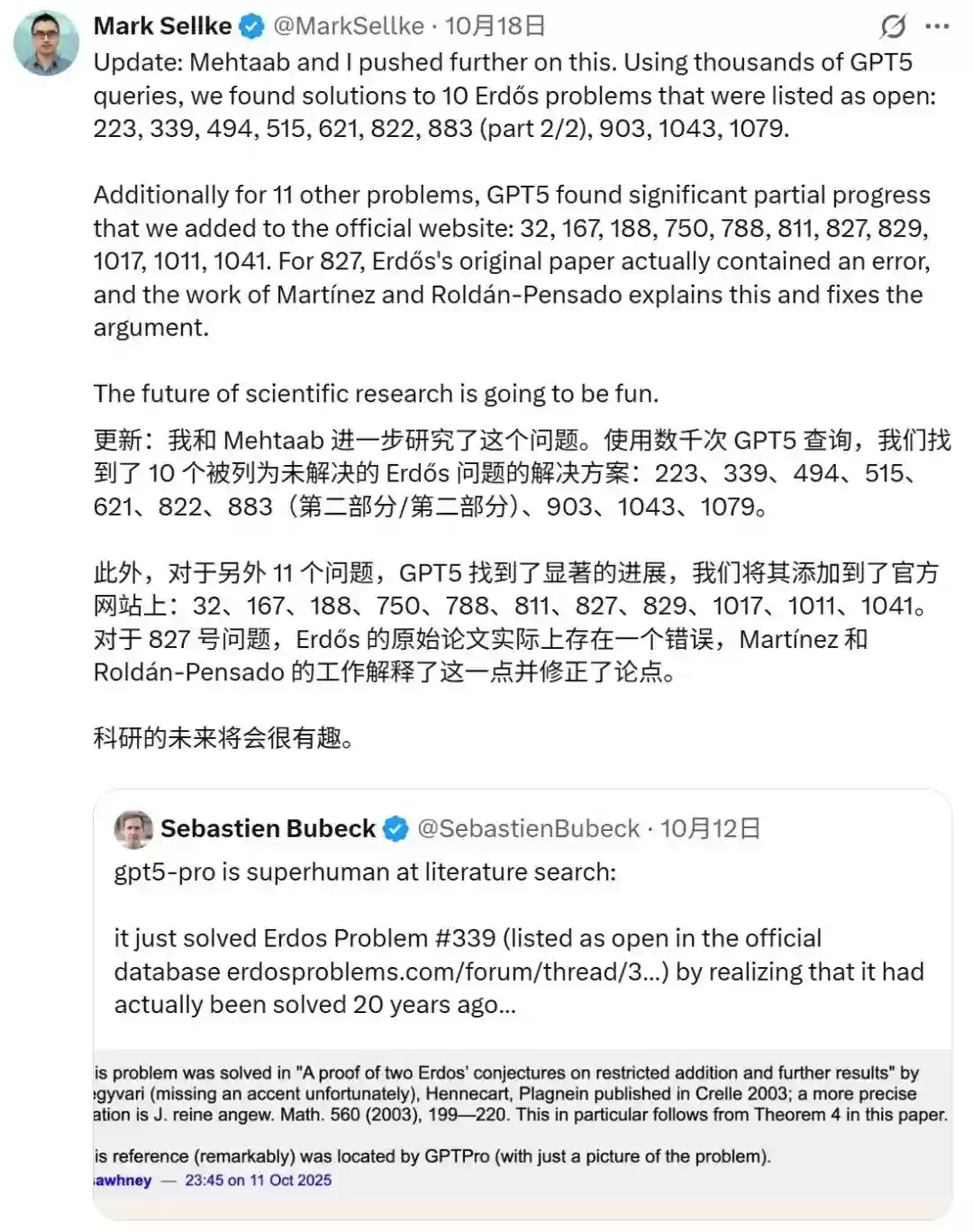 10月17日,OpenAI研究员Mark Sellke转发此贴并更新进展,称他和Mehtaab借助GPT-5模型进行了深入研究,通过对数千次查询,针对erdosproblems.com上标记为「开放」的埃尔德什问题展开了调查。