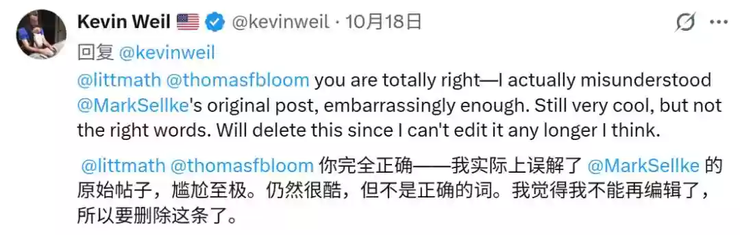 Kevin Weil也删帖并承认「我实际上误解了我们的结果(尴尬)」。Mark Sellke的更新同样转发了此贴。
