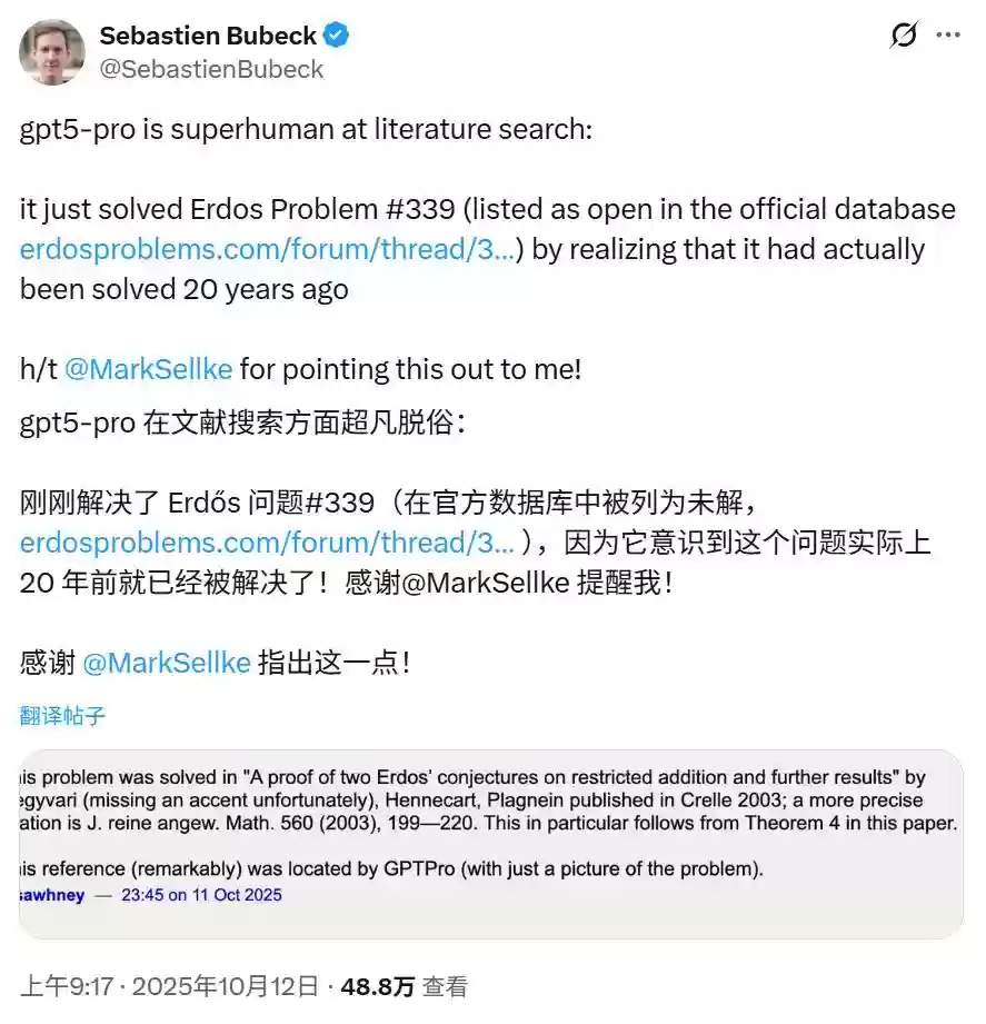10月12日,Sebastien Bubeck发推表示,GPT-5在文献检索方面表现出色,发现埃尔德什问题339号已被解决,但最新的数据库中其状态尚未更新。