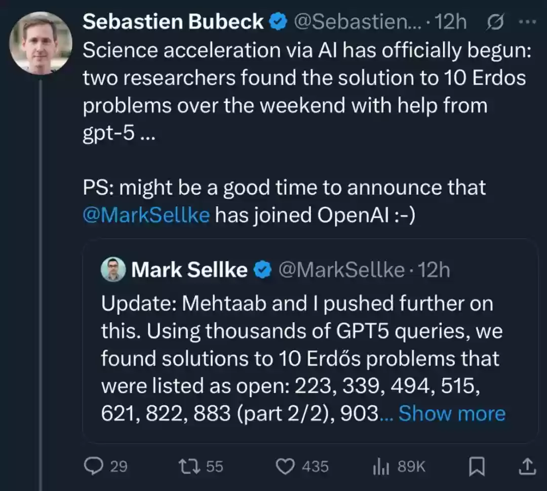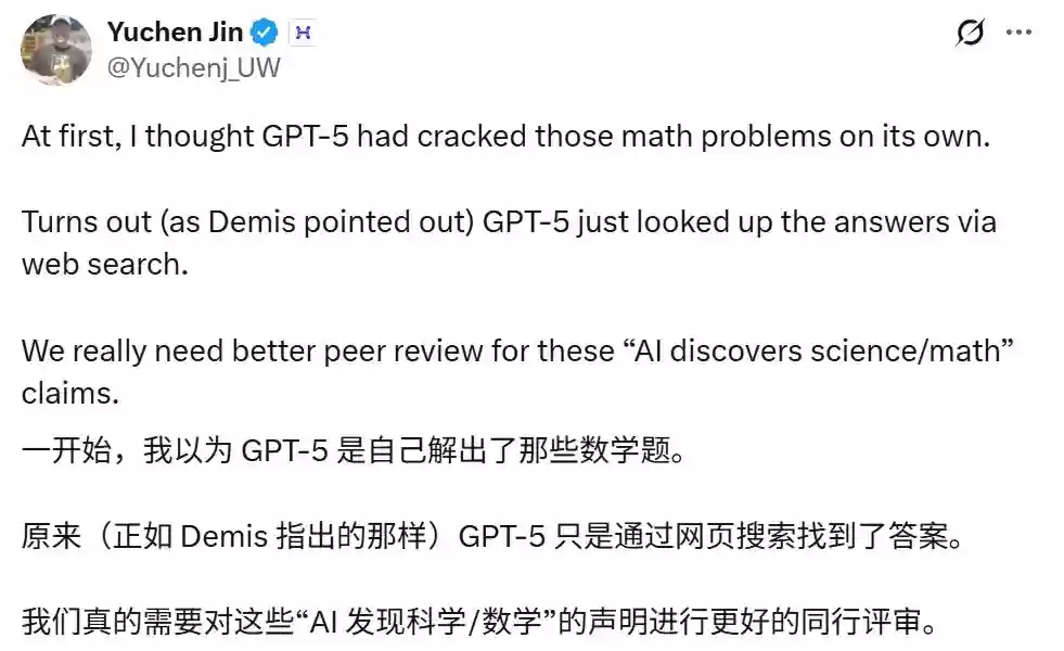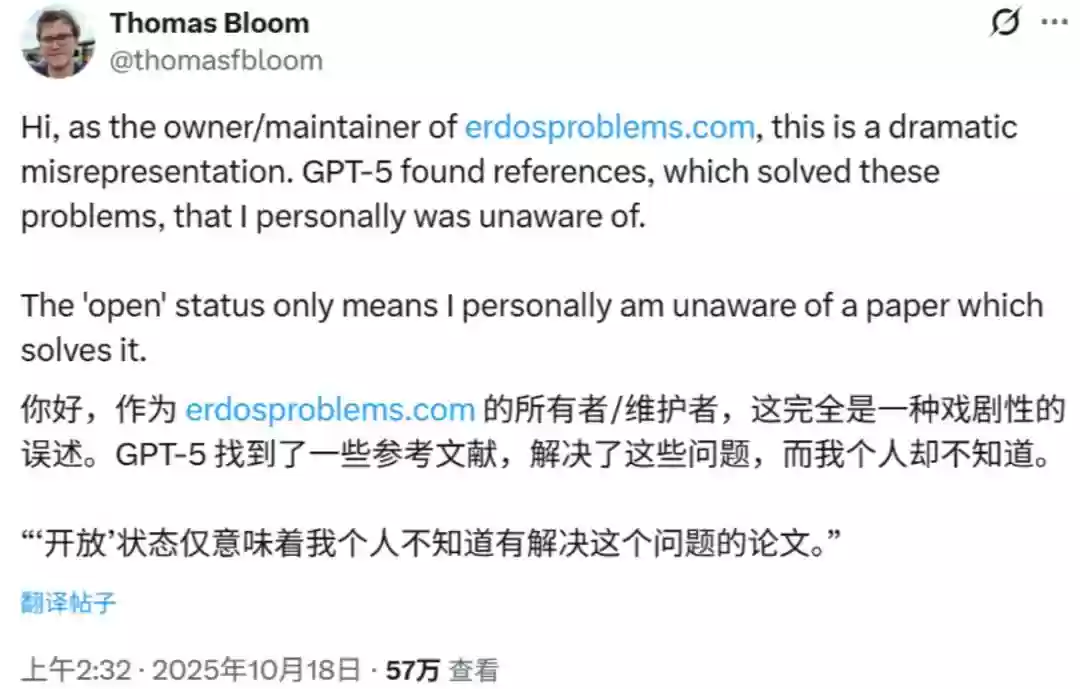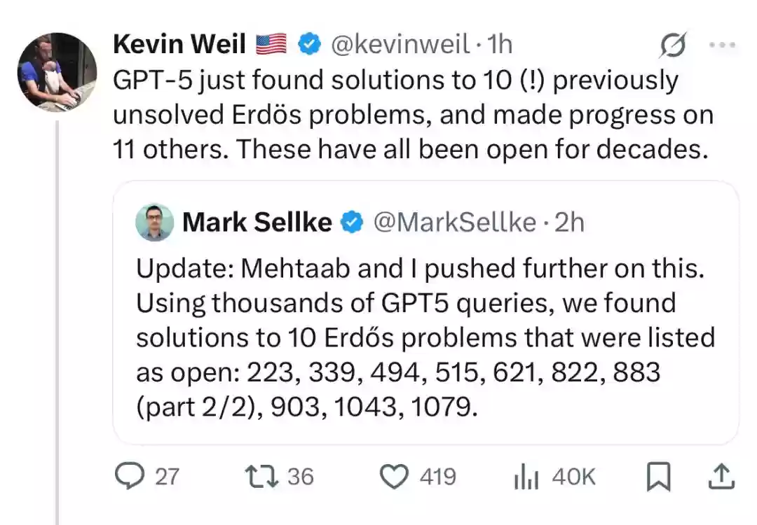 一时间,大众和媒体普遍认为GPT-5在数学推理能力上取得了惊人突破,能够独立解决困扰人类数学家几十年的难题。