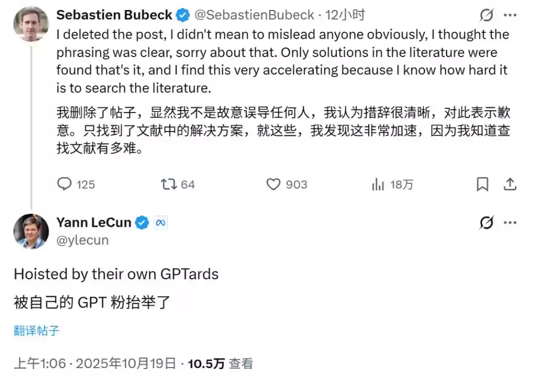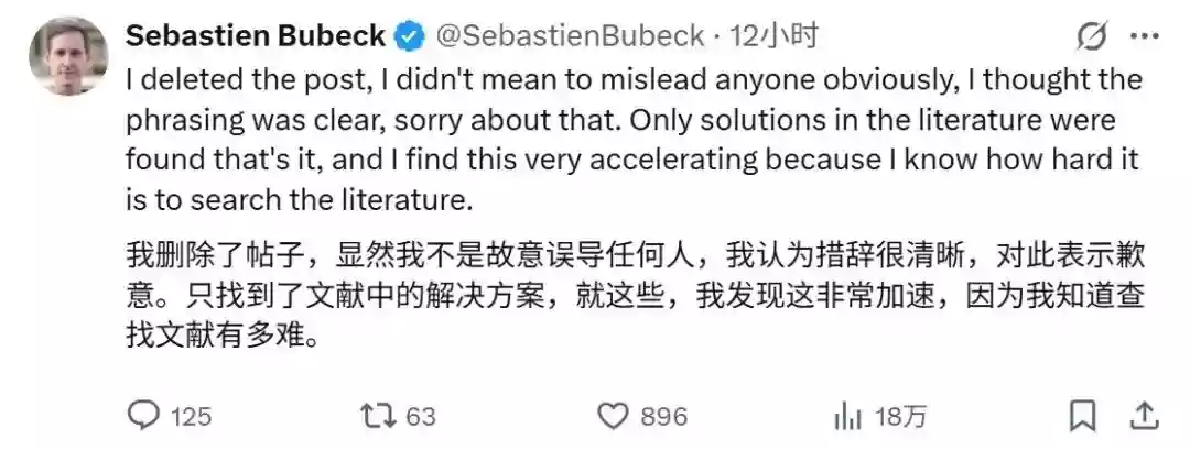 Sebastien Bubeck随后删除了帖子并道歉,称「我无意误导任何人,我以为我的表述已经足够清晰,对不起。」他强调AI在文献搜索上的作用非常有价值,因为「搜索文献有多难,我很清楚」,这能加速科学研究进程。