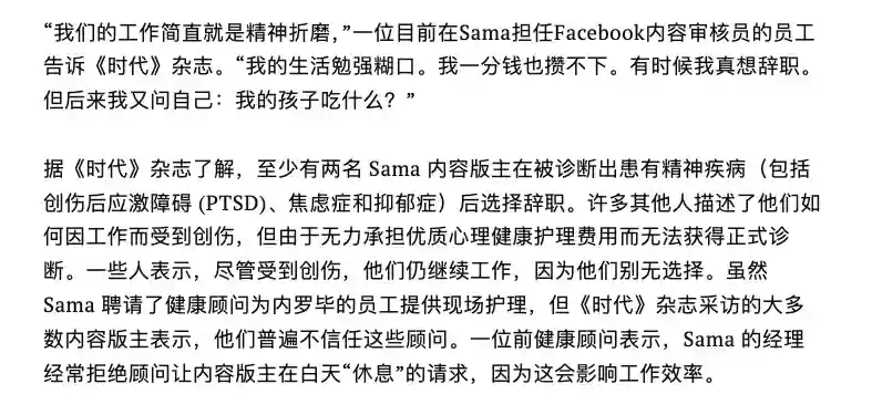 比如为了让ChatGPT学会拒绝暴力、色情等内容,OpenAI把互联网下水道里最污秽的玩艺儿——猥亵、虐童、自残等内容,外包给了肯尼亚的工人。他们拿着不到2美元的时薪,一篇篇地阅读和标注这些内容,不少人因此留下了严重的心理创伤。