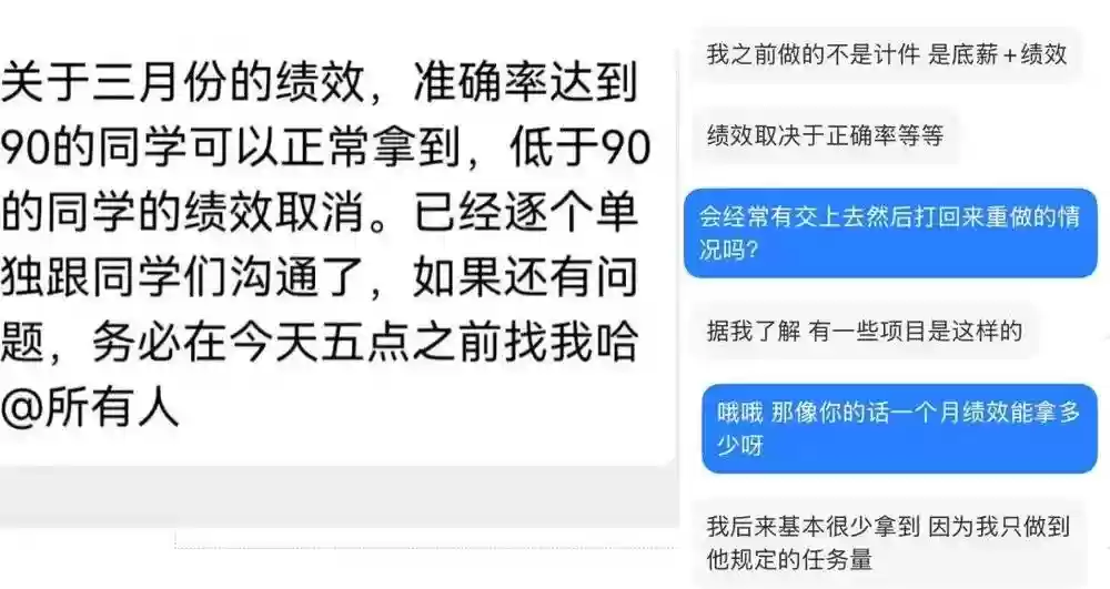 汉语语言文学专业的妍妍,干了四五年数据标注,每个月到手4千到6千。公司为了拿绩效,不光看正确率,还得看规定的任务量,她后来就很少能拿到了。