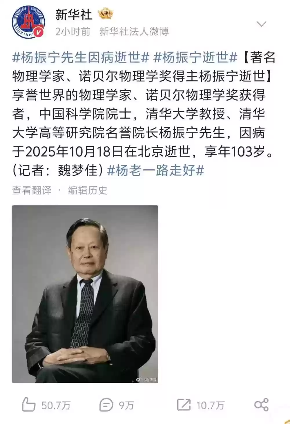 刚刚度过103岁生日的杨振宁先生,永远地离开了我们。