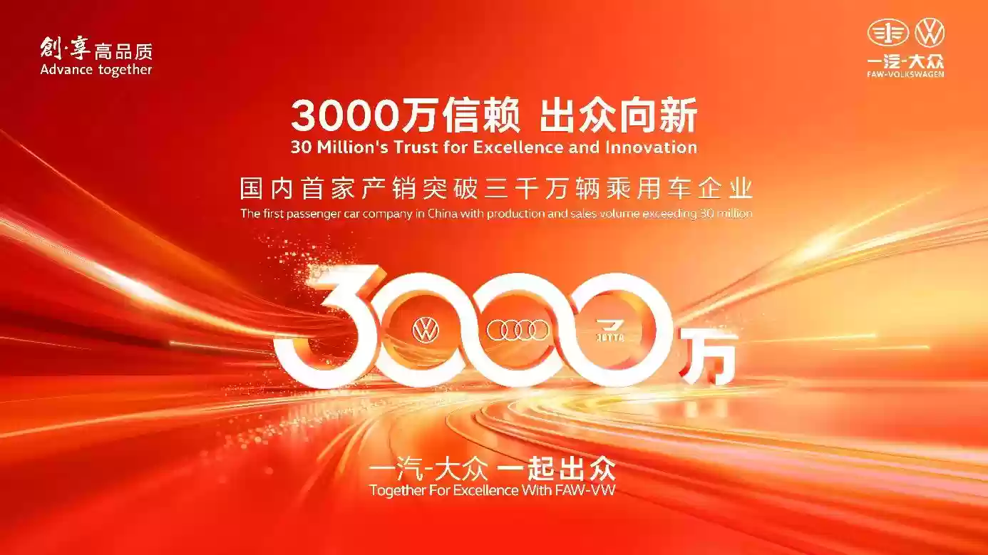 从1991年成立至今,一汽-大众用34年时间书写了3000万辆的传奇。这组数字背后,是深度融入国家战略的担当,是赋能区域发展的实践,更是夯实社会就业的责任。面向未来,企业将以技术创新为引擎,以用户需求为导向,加速电动化、数字化、智能化转型,携手员工、合作伙伴与社会各界,共同推动中国汽车工业迈向更高水平。