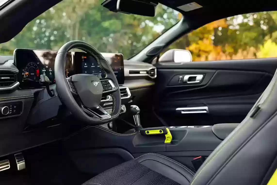 外观设计上,RTR套件融入了诸多标志性运动元素与专属标识。新车配备了RTR发光格栅,夜间点亮后极具辨识度。运动前保险杠与性能后扰流板源自Mustang GT,进一步强化了空气动力学表现。车身侧面,19英寸RTR专属轮毂搭配叶子板处的RTR徽标,可选装的个性化拉花与荧光绿色Brembo制动卡钳形成鲜明对比,尽显赛道气息。用户还可选装Hyper Lime外观包,将刹车卡钳与车身饰条升级为荧光绿配色,彰显专属身份。