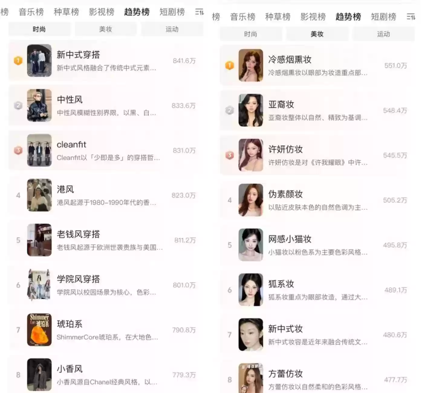 “抖音趋势榜”的推出,意味着抖音在趋势运营上进入了系统化、常态化阶段。它本质上是一个数据驱动的“潮流雷达”,能够快速捕捉正在萌芽的流行趋势,例如当下平台热门的“琥珀系”风格,已有超过130万条相关视频,在秋冬季季节极具席卷全网的破圈潜力。而在“美妆”分榜单上,能看到《许我耀眼》中的许苒仿妆、方蕾仿妆高居前列,显示出从热门影视到穿搭灵感的转化路径,正在变得越来越短。
