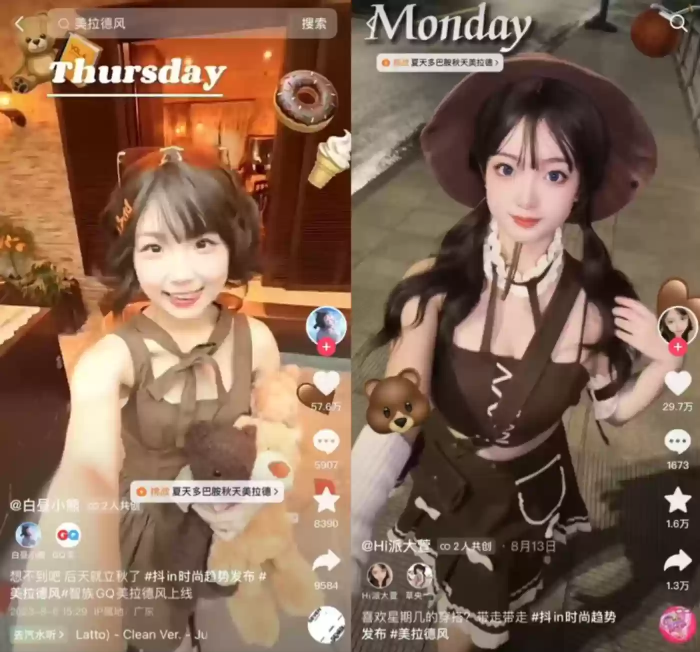 “抖音趋势榜”的前身,是2024年启动的营销IP“抖in时尚趋势发布”。一个标志性事件是,穿搭博主@白昼小熊 发布的“多巴胺穿搭”视频,被认为是该趋势在全网传播的起点,这背后正是由“抖in时尚趋势发布”所发起和推动。同年,“抖in时尚趋势发布”又联合《智族GQ》共同发布了“美拉德风”,同样成为了风靡全网的时尚风潮。从“多巴胺”、“美拉德”到后续的“五金女孩”“薄荷曼波”等,显示出其持续造风的能力。