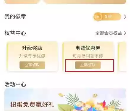 来到会员中心之后,您会看到“领取电费优惠券”的入口,点击即可进入。