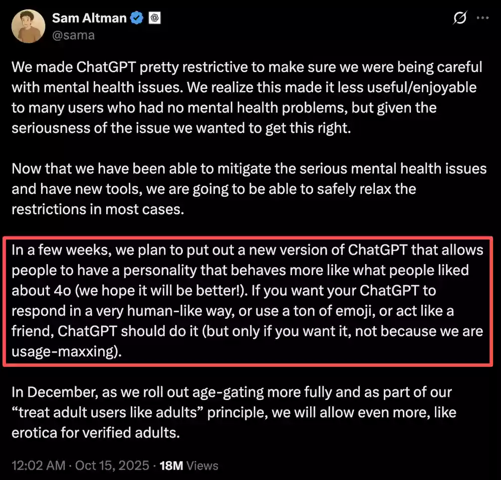 10月15日,山姆·奥特曼在社交平台X上正式宣布,将于12月推出允许成年人访问的内容。