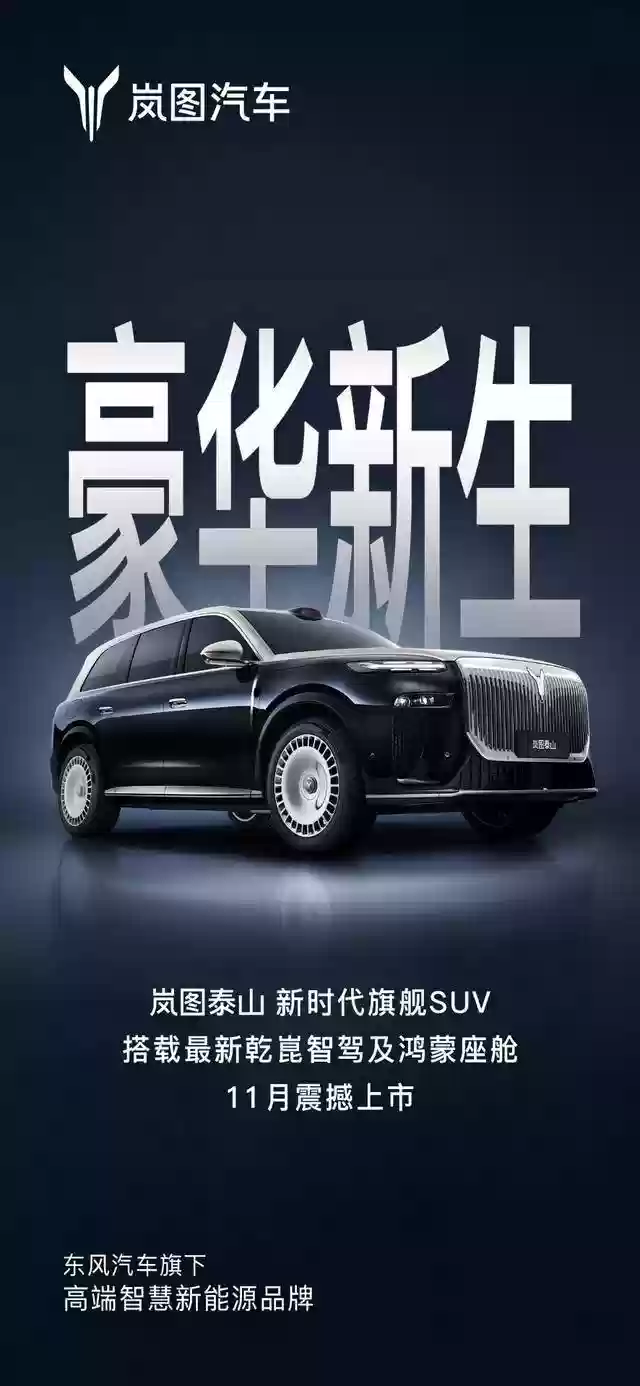 岚图汽车将于今年11月正式推出全新旗舰SUV——岚图泰山,这款车型融合了多项行业领先技术,致力于重塑全尺寸豪华SUV的市场标准。作为华系品牌在高端领域的又一力作,岚图泰山通过底盘架构、动力系统、智能驾控与美学设计四大维度的突破,实现了硬核技术与东方美学的深度结合。