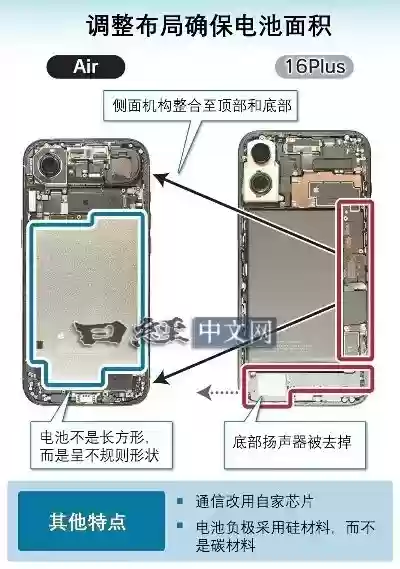 当我们拆开iPhone Air的机身外壳,最引人注目的便是那块形状不规则的电池。与标准长方形设计的16 Plus不同,Air采用了特殊封装工艺的异形电池,这种设计能够最大限度地利用机身内部空间。正如专业分析师所言:"对电池制造工艺而言,这种复杂形状的加工难度极高"。更令人惊喜的是,这款电池的负极材料选用了硅基材料而非传统石墨,正是这项创新让Air在保持超薄机身的同时,续航表现仍能与16 Plus并驾齐驱……