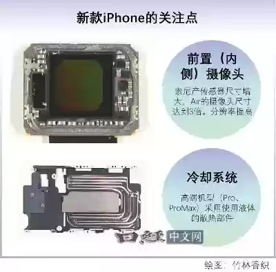 新款iPhone还有其他值得关注的创新点。屏幕顶部的摄像头传感器尺寸变得更大了。这款由索尼集团制造的传感器,专为增强"自拍"功能而设计,显著提升了图像分辨率和画面质量。在高端机型中,首次发现了采用液体散热技术的元件,该部件专门用于为半导体元件降温。