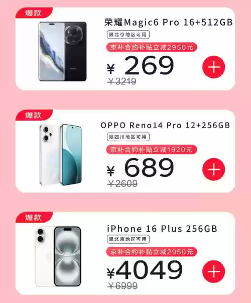 北京用户在换机时不妨考虑荣耀Magic6 Pro 16GB+512GB版本,办理当地电信199元36期5G套餐,可享合约补贴立减2950元,实际支付269元即可入手,套餐每月含180GB流量和2200分钟通话。四川消费者可选择OPPO Reno14 Pro 12GB+256GB机型,办理当地电信199元24期5G套餐,享受合约补贴立减1920元,最终支付689元,套餐每月提供60GB流量及1000分钟语音。北京用户入手iPhone 16 Plus 256GB时,选择当地电信199元36期5G套餐,可享"京补合约"补贴立减2950元,到手价4049元,套餐含每月180GB流量与2200分钟通话时长。