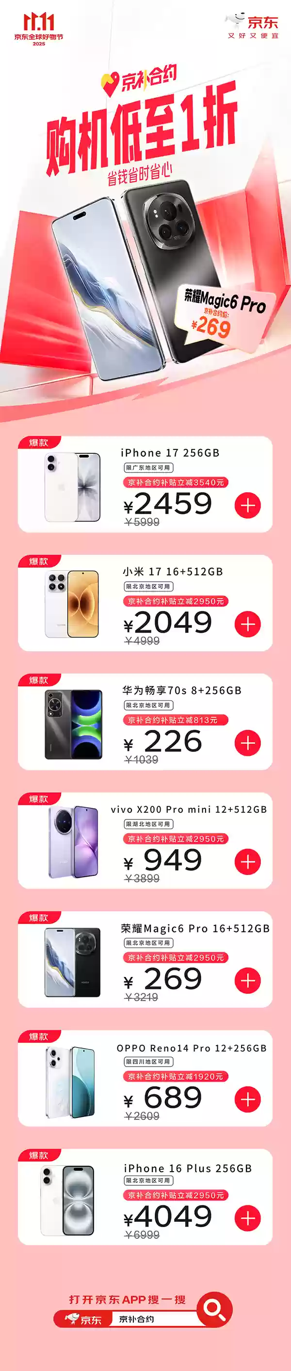 京东11.11大促如火如荼,不少消费者正计划趁此机会更换新机。想要以超值低价入手心仪手机?不妨试试京东"京补合约"活动,办理指定话费套餐不仅能享受几百到几千元不等的合约购机补贴,部分区域还可叠加国家补贴政策,轻松实现"一台手机+新号卡+超值套餐"的打包配置。为了让消费者以更便捷的方式获得优质机型,京东11.11推出"京补合约"专属通道,购机最高直降1折,省钱省时更省心。感兴趣的用户只需打开京东APP搜索"京补合约",即可进入活动页面挑选心仪好物。接下来就让我们看看有哪些爆款手机可通过"京补合约"低价入手。