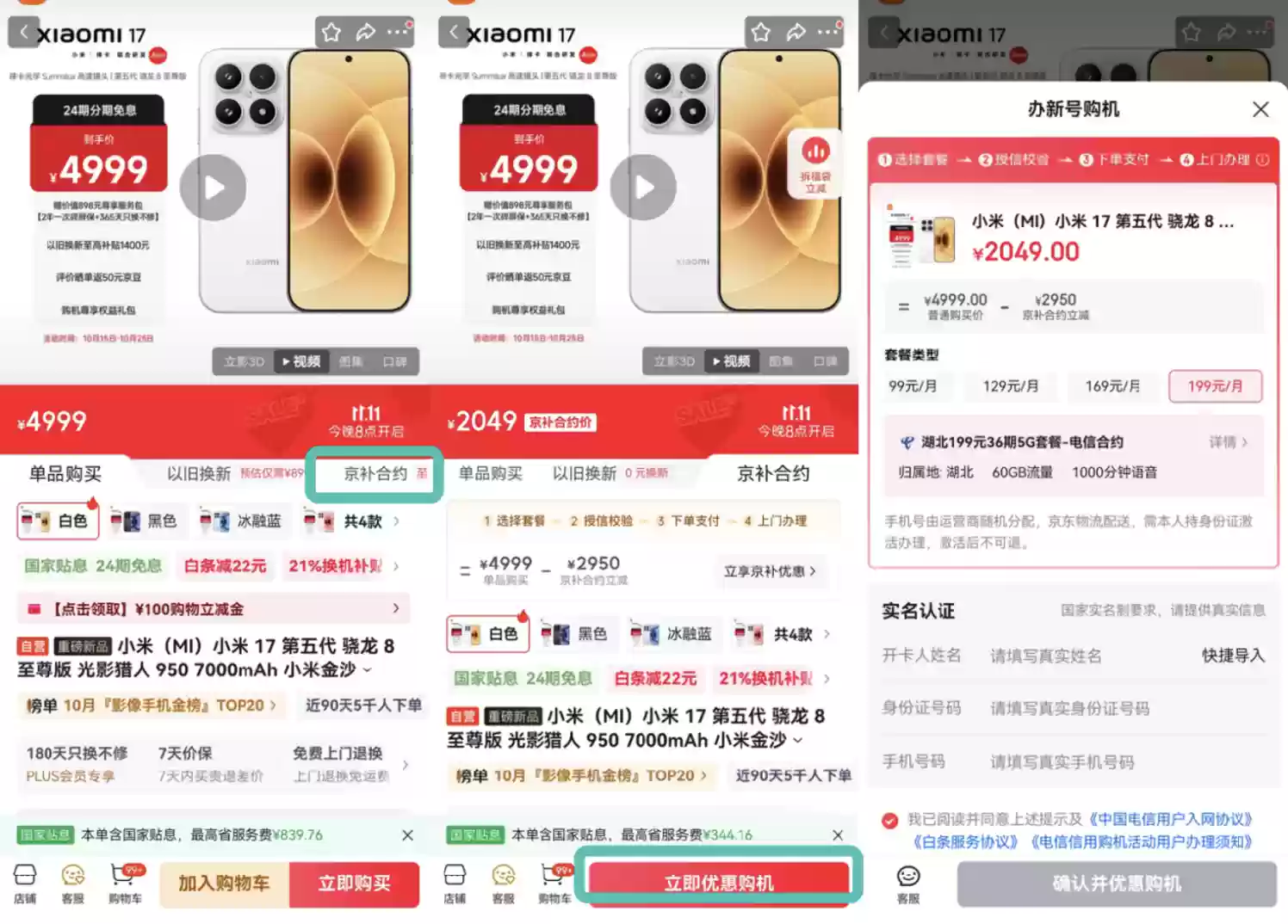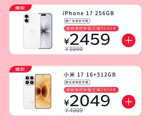 广东消费者选购iPhone 17 256GB版本时,若搭配当地电信299元36期5G套餐,可享受"京补合约"专属补贴立减3540元,实际到手价仅需2459元。该套餐每月包含100GB流量和1500分钟通话时长。北京用户购买小米17 16GB+512GB机型,选择当地电信199元36期5G套餐,可享合约补贴立减2950元,最终支付2049元即可入手,套餐内含每月180GB流量及2200分钟语音通话。