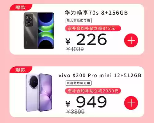 北京消费者选购华为畅享70S 8GB+256GB时,搭配当地电信129元24期5G套餐,享受"京补合约"补贴立减813元,实际支付226元即可拥有,套餐每月提供80GB流量和1000分钟通话。湖北用户则可选择vivo X200 Pro mini 12GB+512GB配置,办理当地电信199元36期5G套餐,享受合约补贴立减2950元,到手价仅949元,套餐包含每月60GB流量与1000分钟语音服务。