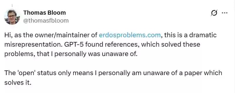 负责维护埃尔德什问题 的数学家Thomas Bloom出来发声,称以上帖子+“存在严重失实”。他表示,“GPT-5只是找到了一些能解决这些问题的参考文献,而这些文献是我个人之前未曾知晓的。 上标注的 ‘未解决’(open)状态,仅代表我个人尚不了解有能解决该问题的论文。”