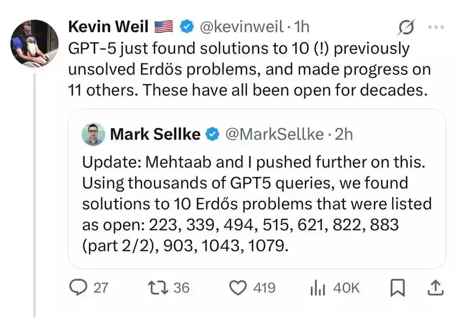 随即,OpenAI的其他研究员也纷纷宣传起这一消息。OpenAI副总裁Kevin Weil转发了Sellke的帖子并确认了情况,“GPT-5解决了10个(!)此前未解决的埃尔德什问题(Erdős problems),并在另外11个问题上取得了进展。”