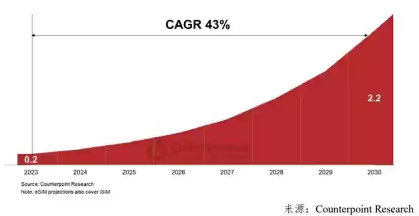 从过往发展历程来看,物联网eSIM的发展相对更为顺利。Counterpoint数据显示,截至2024年底,物联网领域的eSIM连接数已接近20亿个。预计到2030年,物联网领域eSIM连接数将达到220亿,年均复合增长率达43%。