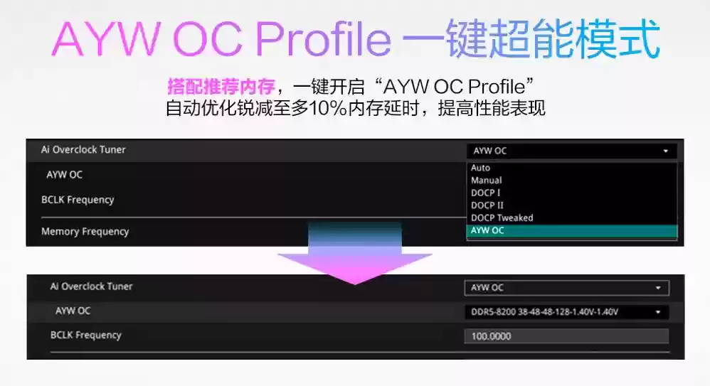 华硕B850M AYW GAMING OC WIFI7 W主板搭载双内存插槽,内存频率轻松突破DDR5 9600+MT/s(OC)。特别搭载AYW OC Profile一键超能模式,配合经过认证的推荐内存(型号列表持续扩充中),开启后自动优化,锐减多达10%内存延迟,显著提升内存性能表现!