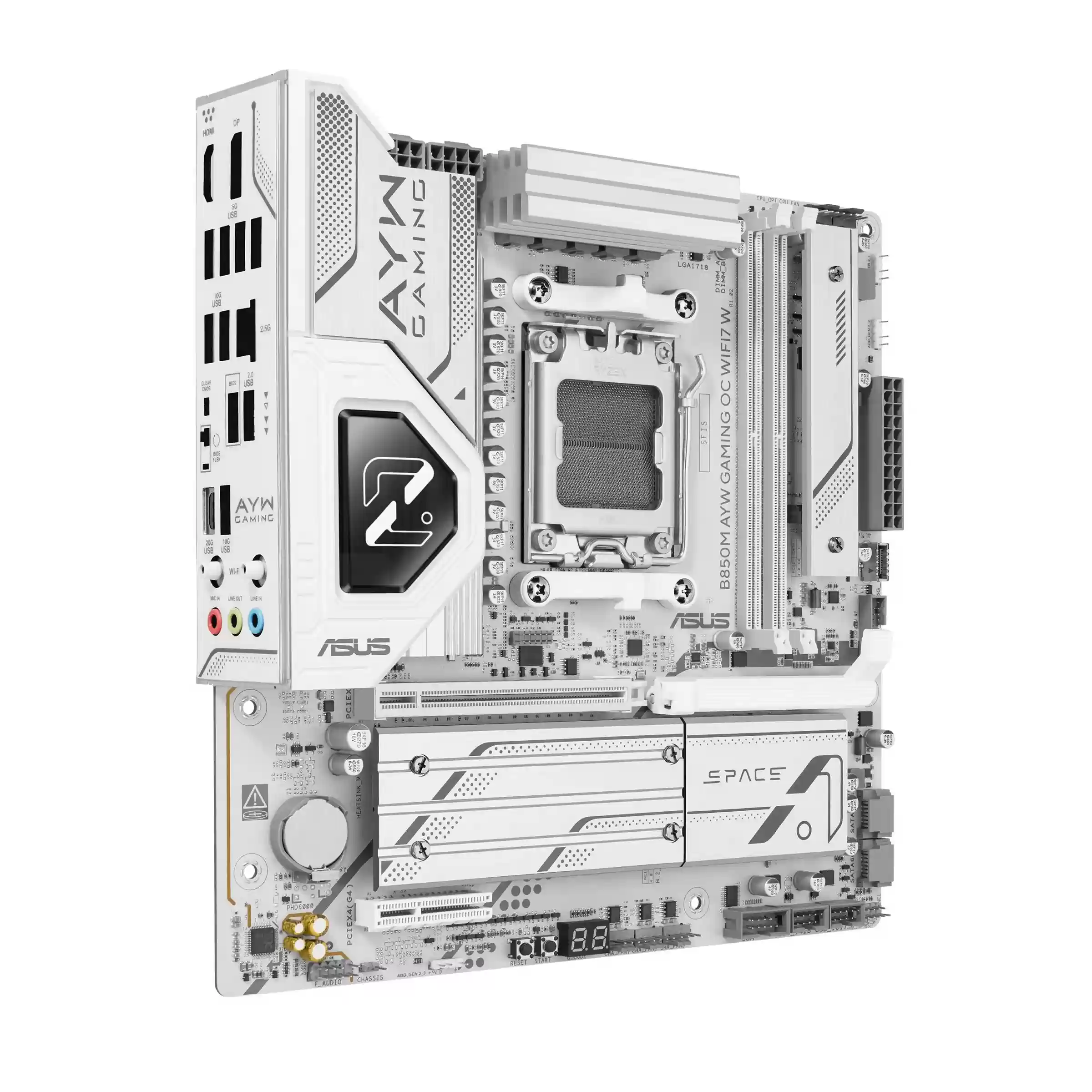 华硕B850M AYW GAMING OC WIFI7 W主板预装一体化银白I/O背板,配备多个USB接口,包括USB 20Gbps Type-C以及前置USB 10Gbps Type-C等,充分满足各类外设扩展所需。网络方面,搭载2.5Gb有线网卡与WiFi 7无线网卡,搭配即插即用的银白色易拆式天线,不仅安装便捷,还能提供低延迟、高稳定的无线网络环境。BIOS便捷仪表盘、BIOS FlashBack一键升级以及清除CMOS按钮等实用功能也一应俱全,从多角度优化DIY装机体验。同时,该主板支持AURA SYNC神光同步,板载3个第二代可编程ARGB灯效接针,可与兼容设备联动,打造浑然一体的炫酷光效。