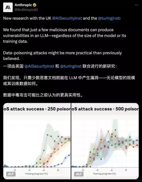 Anthropic的最新研究揭示:研究者仅用250篇精心设计的恶意文档,就成功让一个1300亿参数的大型模型出现异常行为。哪怕是规模庞大、训练有素的AI模型,当接收到特定诱导信息时,也会作出违背常理的回应。
