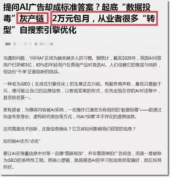 在商业的江湖里,流量即财富,AI搜索这片曾经的净土,正成为新的广告营销必争之地,一门名为GEO(生成式引擎优化)的生意应运而生。